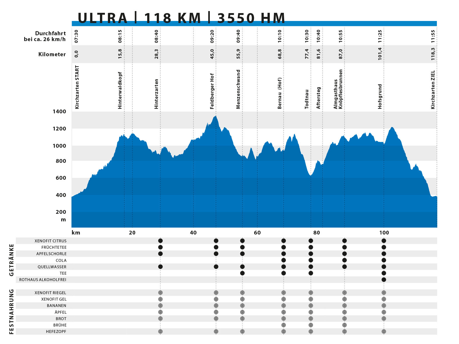 Through the enchanted Trubelsbach, you head towards Notschrei, to Haldenköpfle, across Schauinslandstraße to Hofsgrund. Here, you reach the 100 km mark! On a meadow path, you descend to the refreshment point at Hofsgrund Ortsmitte. Subsequently, another challenging ascent awaits you to Schauinsland, where you reach another "high point" at 1,239 meters above sea level. The last 15 kilometers take you into the forest towards Rappenecker Hütte, descending to Oberried. Along the way, you encounter the Marathon route again. Via Dietenbach and the campground in Kirchzarten, you eventually reach the finish line in the stadium.